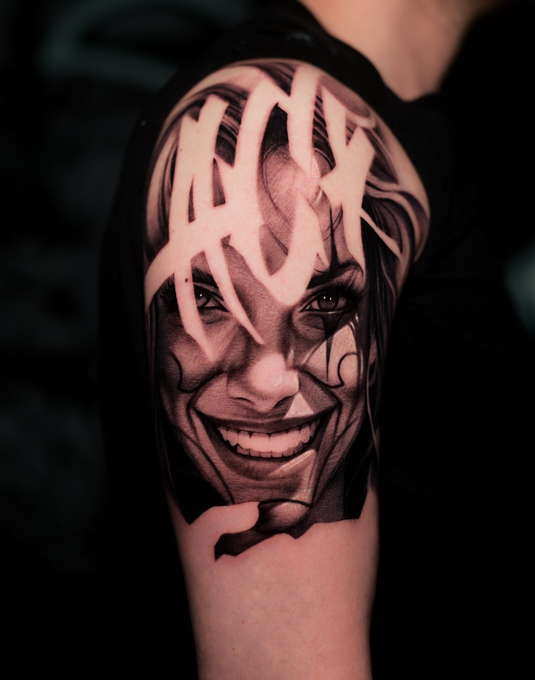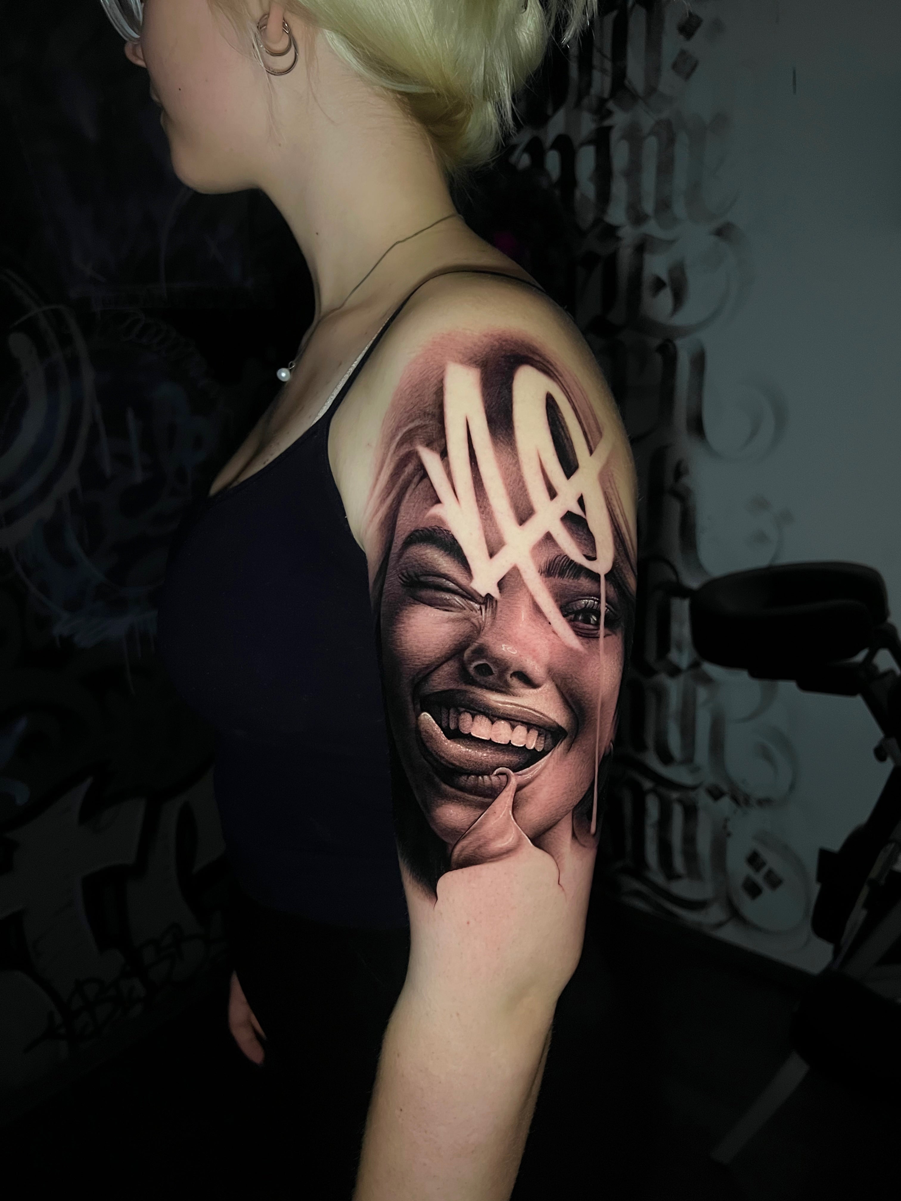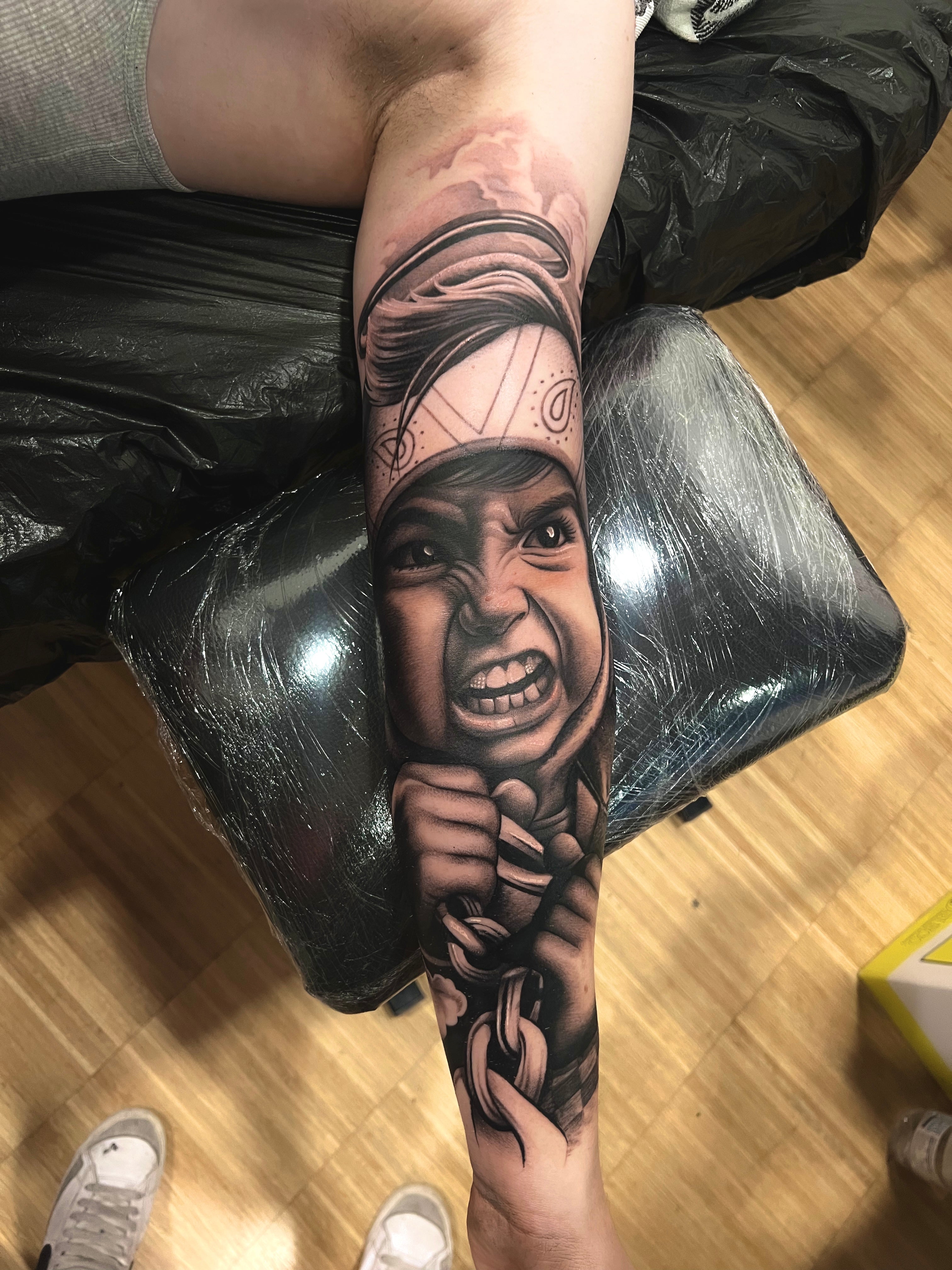 Now, I’ve been working as a tattoo artist for around 10 years in my own shop in a small village near Frankfurt. I specialize in black and grey tattoos with influences from Chicano art. I love tattooing faces, creating depth, and playing with shadow and light. My favorite pieces are celebrity portraits and child portraits—anything where emotion comes through in the details.