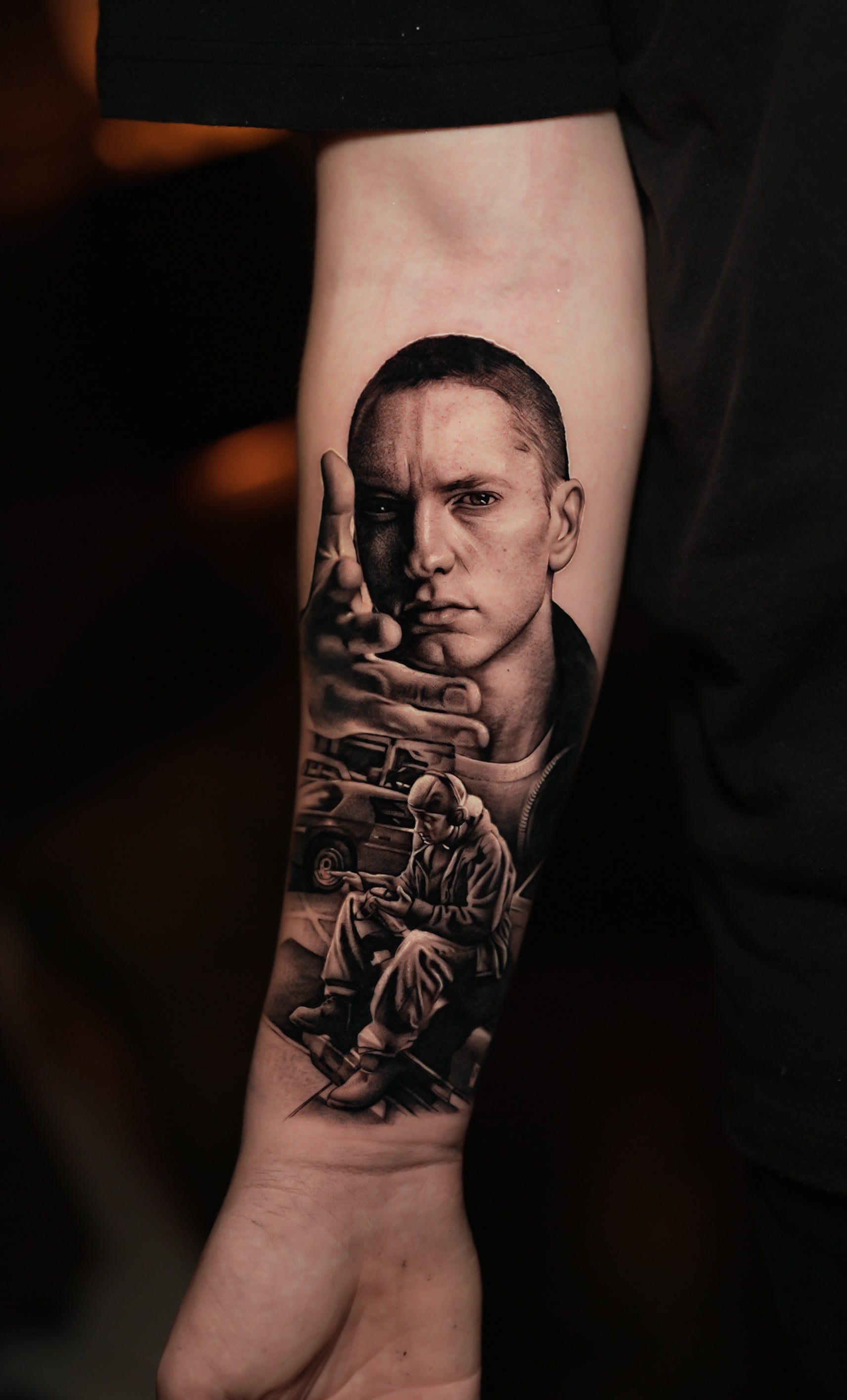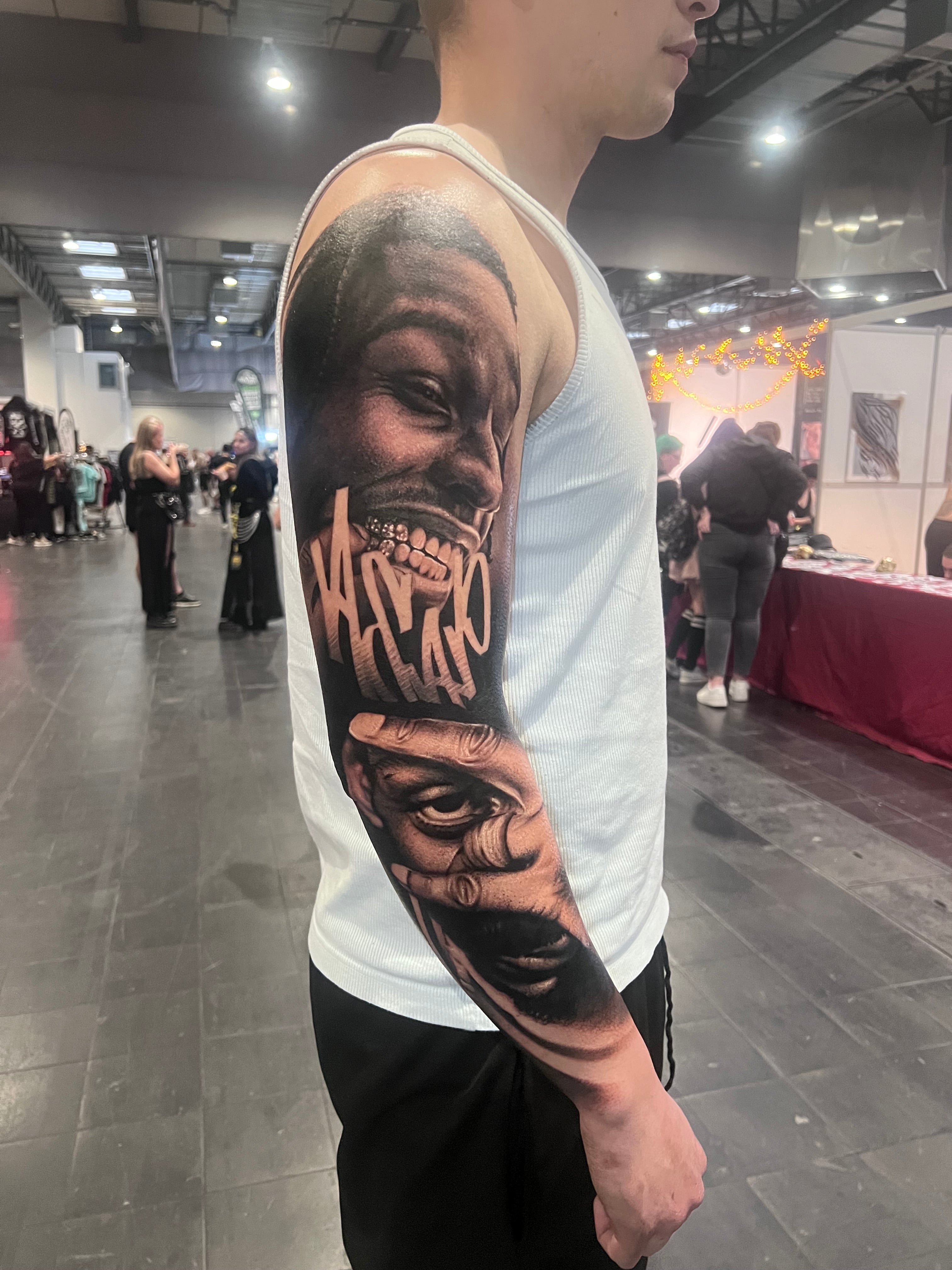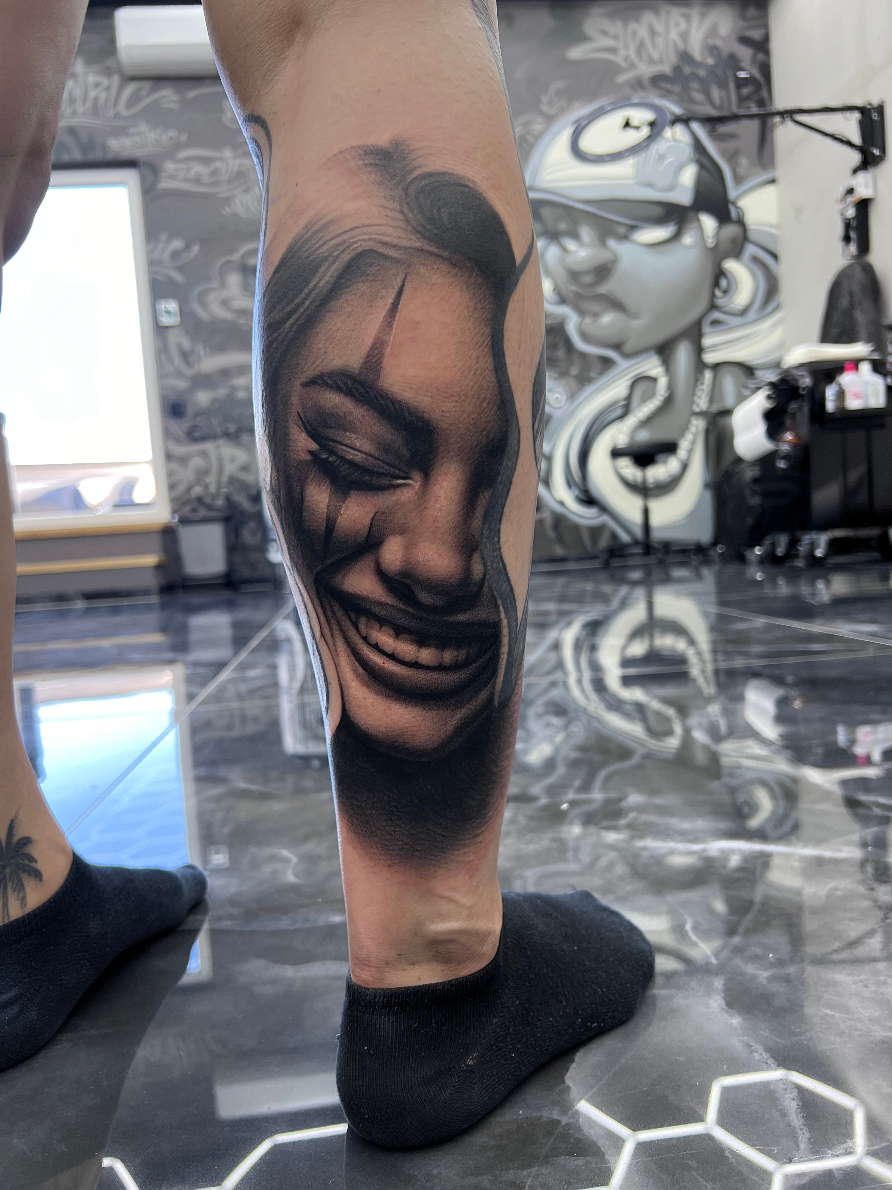 Now, I’ve been working as a tattoo artist for around 10 years in my own shop in a small village near Frankfurt. I specialize in black and grey tattoos with influences from Chicano art. I love tattooing faces, creating depth, and playing with shadow and light. My favorite pieces are celebrity portraits and child portraits—anything where emotion comes through in the details.