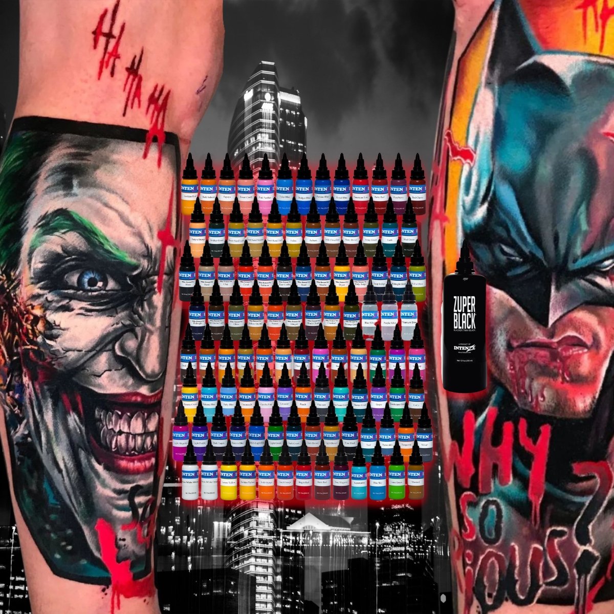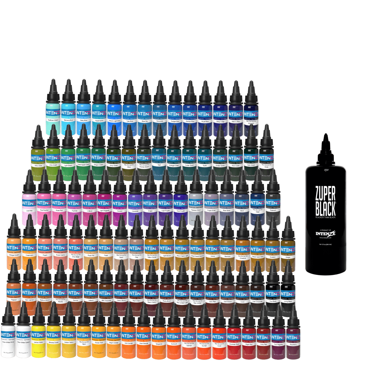 The 101 Color Tattoo Ink Set is a robust color set that covers the main line of INTENZE colors. In addition to 101 color inks, you'll receive a bottle of Snow White Opaque, Snow White Mixing, True Black, and Zuper Black with your order.